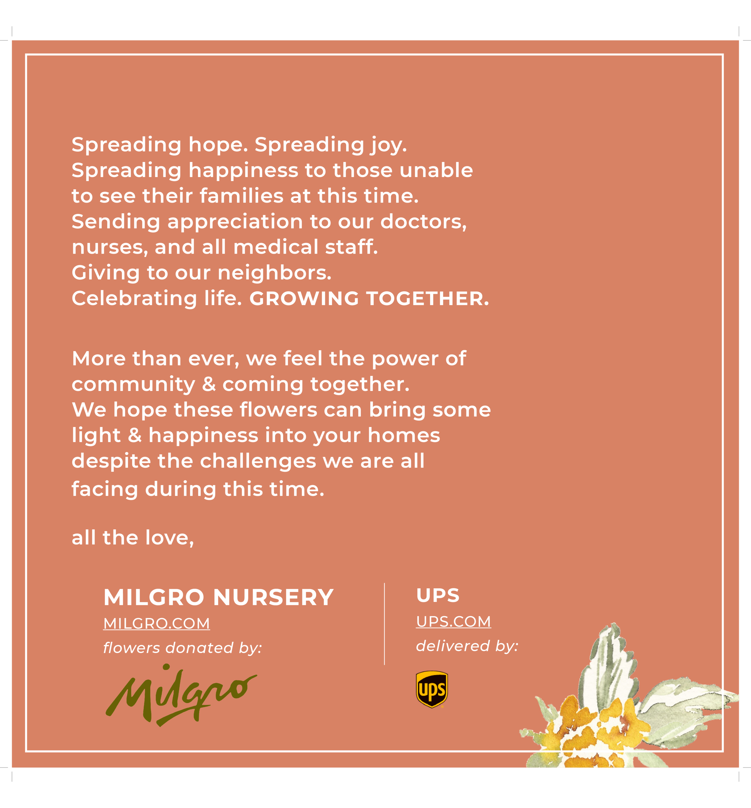 Neil had connections with Jim Castimore of Casco Salt, based in New Jersey, who agreed to accept a semi-truck load of 15,000 flowers. The flowers were then delivered to nursing homes in New Jersery and six NYC Health + Hospitals. From coast to coast, love was shared and communities were brought together. Alongside ERA Real Estate, Milgro felt the appreciation from those that had received flowers. As shared in the card delivered with Milgro’s flowers, we truly feel the power of community and coming together, especially in trying times. It brings so much joy to grow roots in homes and communities, both near and far.